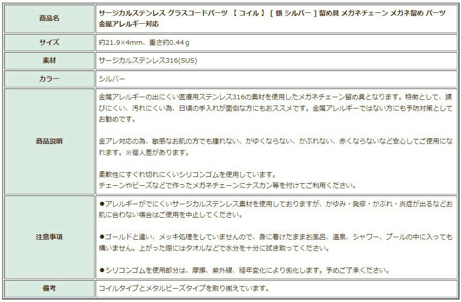 他の画像を見る 金アレ 316 ニッケルフリー メガネチェーン メガネ留め パーツ [10個] 316 グラスコードパーツ 【 コイル 】 [ 銀 シルバー ] サージカルステンレス 留め具 メガネチェーン メガネ留め 素材 金属アレルギー対応 O-05 当店特別価格 ¥ 499 税込 カートに入れる お気に入りに登録する