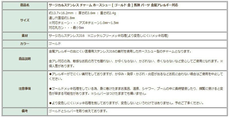 商品名 サージカルステンレス チャーム ホースシュー [ ゴールド 金 ] 馬蹄 パーツ 金属アレルギー対応