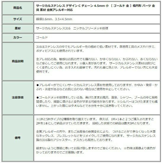 商品名 サージカルステンレス デザイン C チェーン 4.5mm 小 [ ゴールド 金 ]楕円形 パーツ 金具 素材 金属アレルギー対応