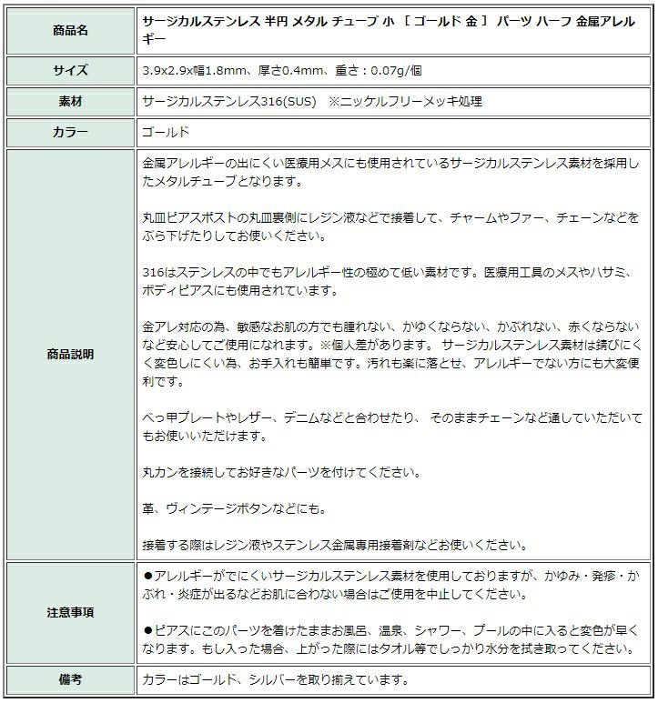 商品名 サージカルステンレス 半円 メタル チューブ 小 [ ゴールド 金 ] パーツ ハーフ 金属アレルギー