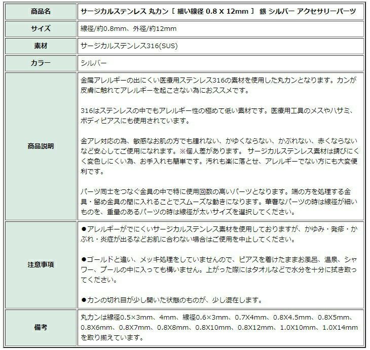 商品名 サージカルステンレス 丸カン[ 細い線径 0.8 X 12mm ] 銀 シルバー アクセサリーパーツ