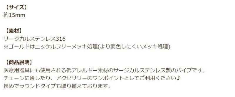 医療用器具にも使用される低アレルギー素材のサージカルステンレス製のパイプです。