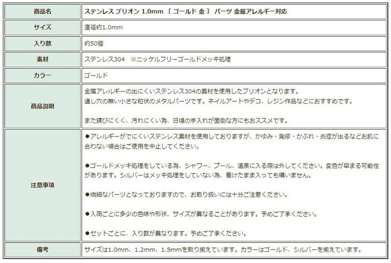 商品名 ステンレス ブリオン 1.0mm [ ゴールド 金 ] パーツ 金属アレルギー対応
