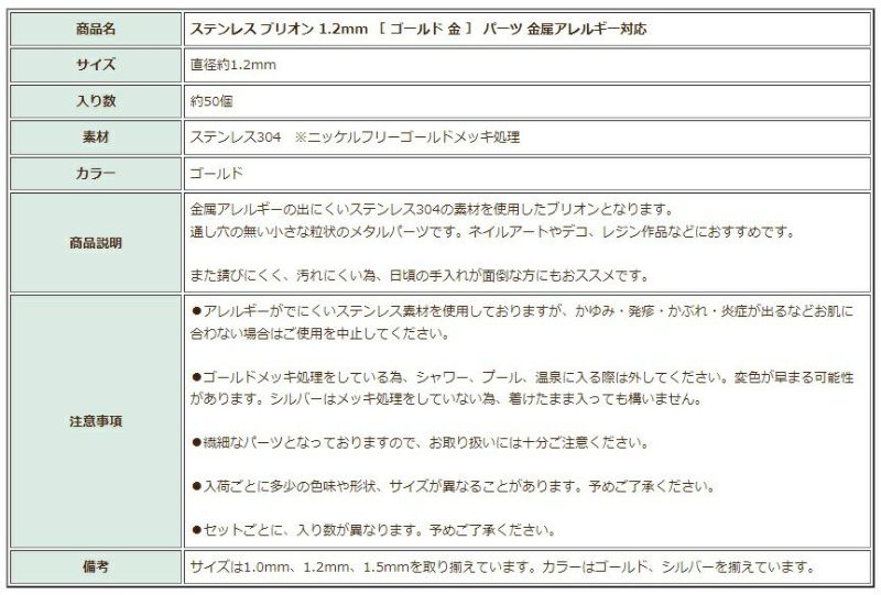商品名 ステンレス ブリオン 1.2mm [ ゴールド 金 ] パーツ 金属アレルギー対応