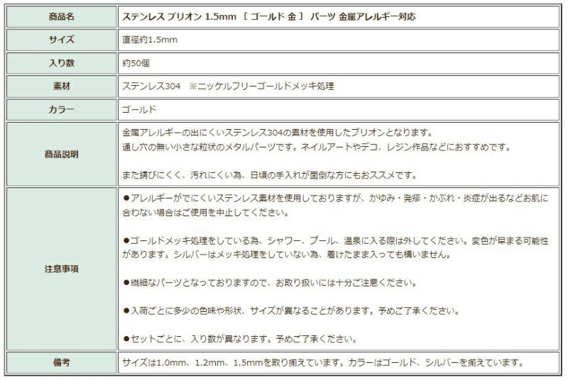 商品名 ステンレス ブリオン 1.5mm [ ゴールド 金 ] パーツ 金属アレルギー対応