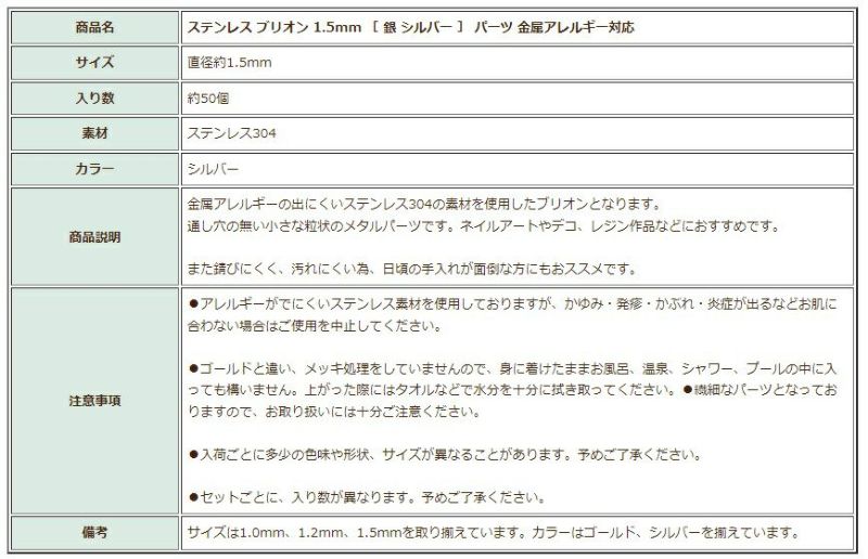 商品名 ステンレス ブリオン 1.5mm [ 銀 シルバー ] パーツ 金属アレルギー対応