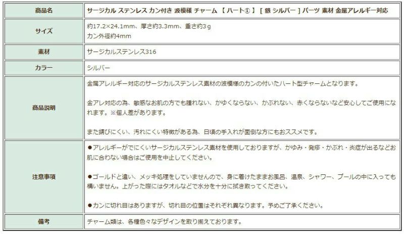 商品説明 金属アレルギー対応のサージカルステンレス素材の波模様のカンの付いたハート型チャームとなります。