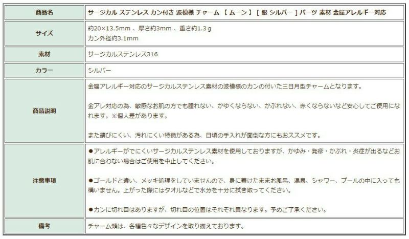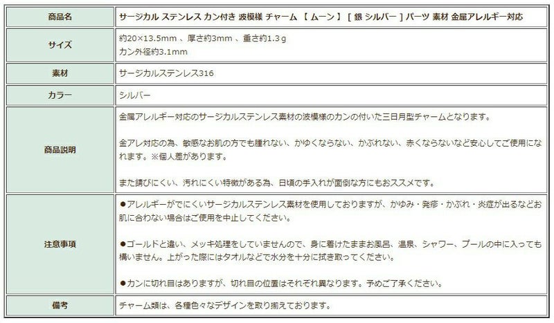商品名 サージカル ステンレス カン付き 波模様 チャーム 【 ムーン 】 [ 銀 シルバー ] パーツ 素材 金属アレルギー対応