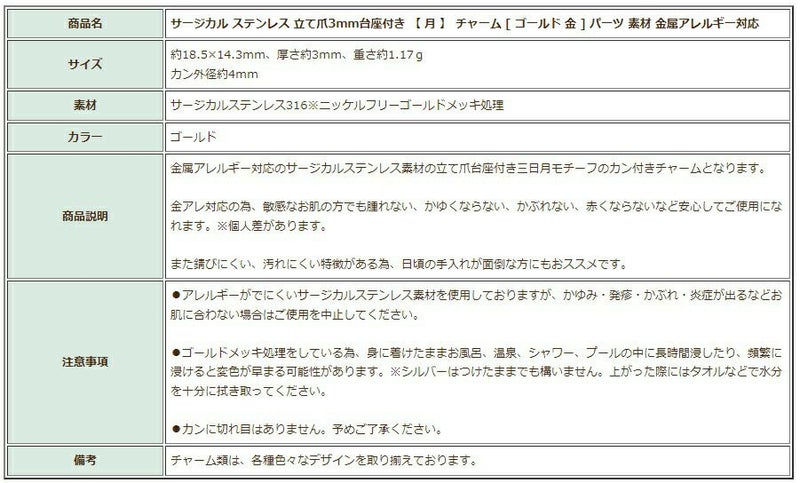 サージカル ステンレス 立て爪3mm台座付き 【 月 】 チャーム [ ゴールド 金 ] パーツ 素材 金属アレルギー対応