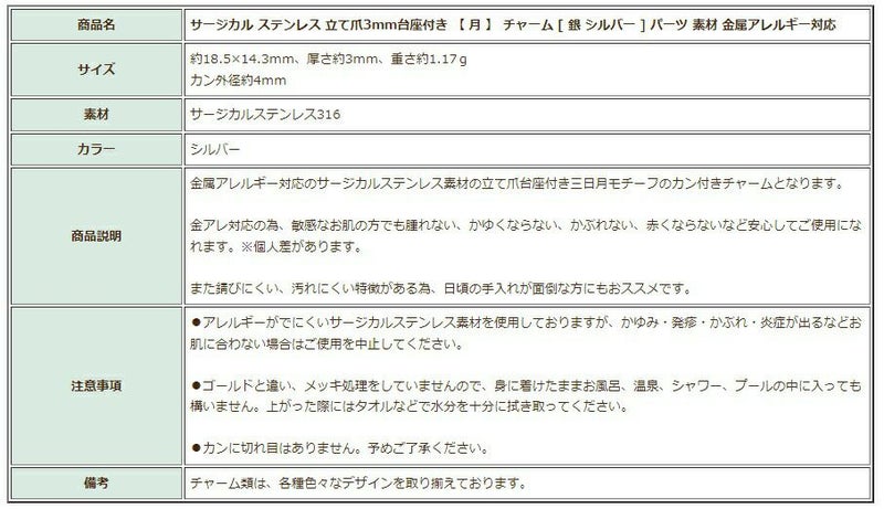 商品名 サージカル ステンレス 立て爪3mm台座付き 【 月 】 チャーム [ 銀 シルバー ] パーツ 素材 金属アレルギー対応