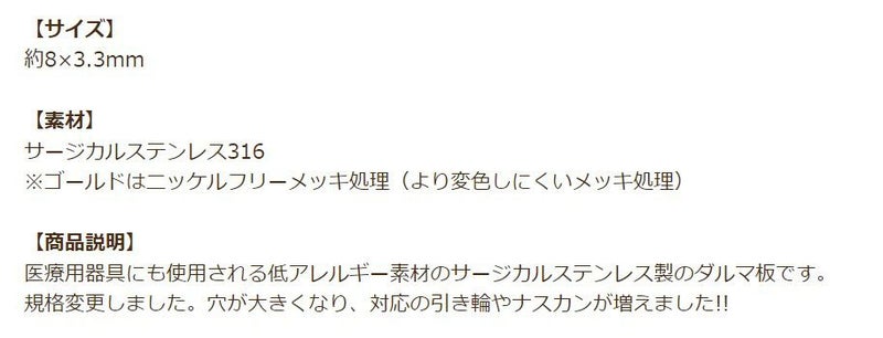 医療用器具にも使用される低アレルギー素材のサージカルステンレス製のダルマ板です。