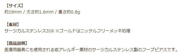 医療用器具にも使用される低アレルギー素材のサージカルステンレス製のフープピアスです。