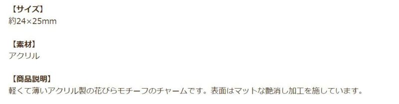 軽くて薄いアクリル製の花びらモチーフのチャームです。表面はマットな艶消し加工を施しています。