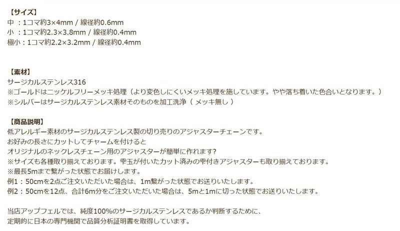 低アレルギー素材のサージカルステンレス製の切り売りのアジャスターチェーンです。