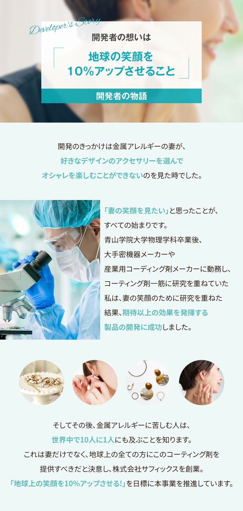 青山学院大学物理学科卒業後、大手密機器メーカーや産業用コーディング剤メーカーに動務し、コーティング剤一筋に研究を重ねていた私は、妻の笑顔のために研究を重ねた結果、期待以上の効果を発揮する製品の開発に成功しました。