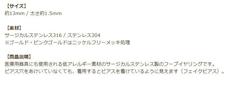 医療用器具にも使用される低アレルギー素材のサージカルステンレス製のフープイヤリングです。