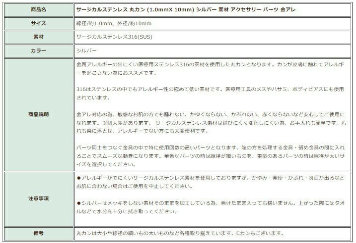 商品名 サージカルステンレス 丸カン (1.0mmX 10mm) シルバー 素材 アクセサリー パーツ 金アレ