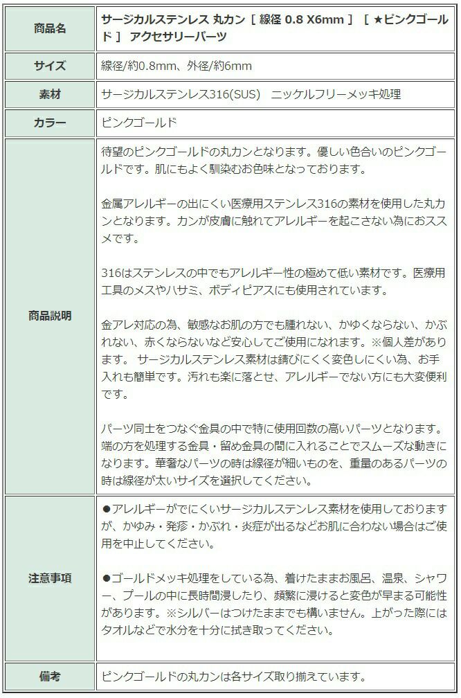 商品名 サージカルステンレス 丸カン[ 線径 0.8 X6mm ][ ★ピンクゴールド ] アクセサリーパーツ