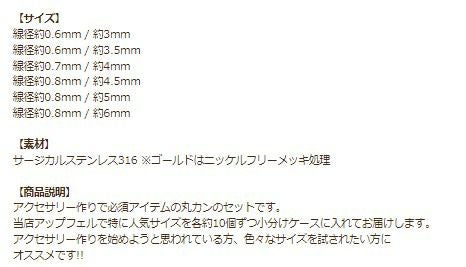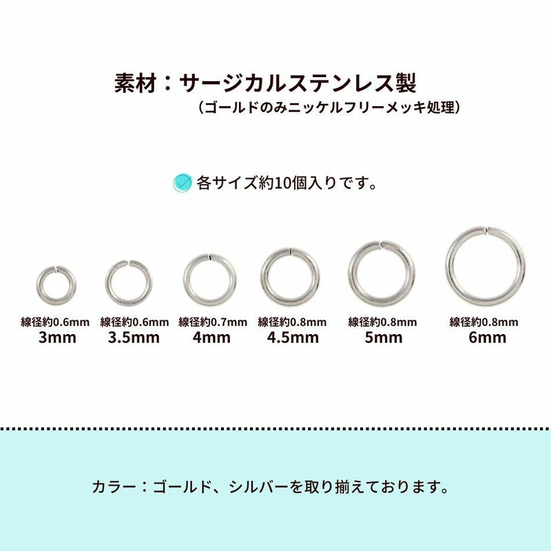 [ 各約10個 ] 丸カン * サンプルセット * 6サイズ セット [ ゴールド 金 ] ケース入り カタログ付き サージカルステンレス パーツ 金属アレルギー対応 CA-01