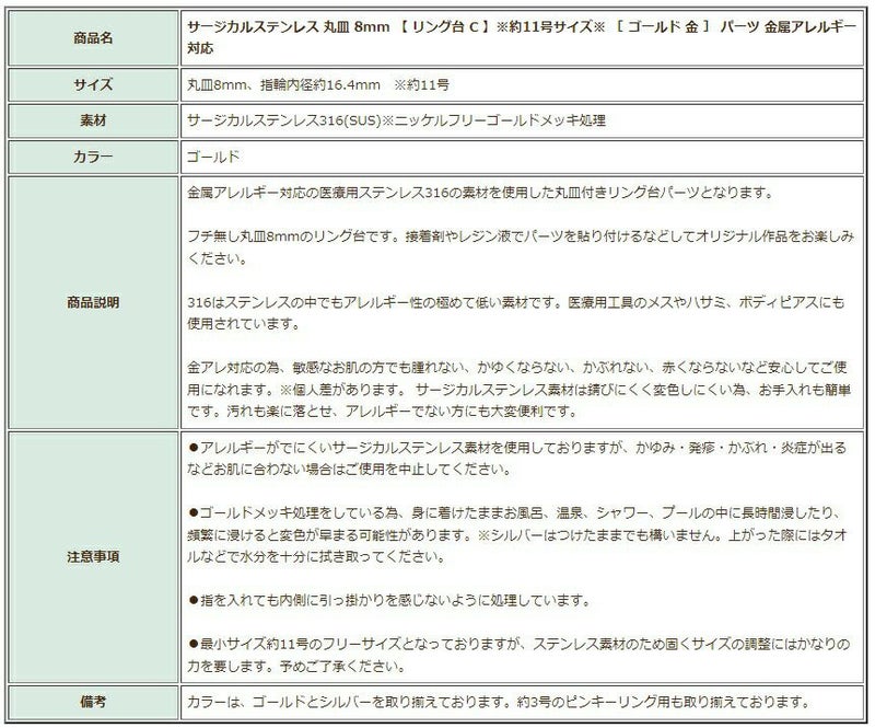 商品名 サージカルステンレス 丸皿 8mm 【 リング台 C 】※約11号サイズ※ [ ゴールド 金 ] パーツ 金属アレルギー対応