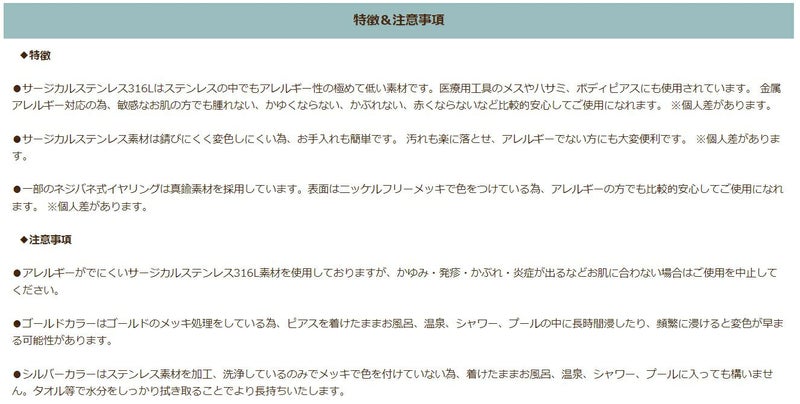 注意事項 ●アレルギーがでにくいサージカルステンレス素材を使用しておりますが、かゆみ・発疹・かぶれ・炎症が出るなどお肌に合わない場合はご使用を中止してください。