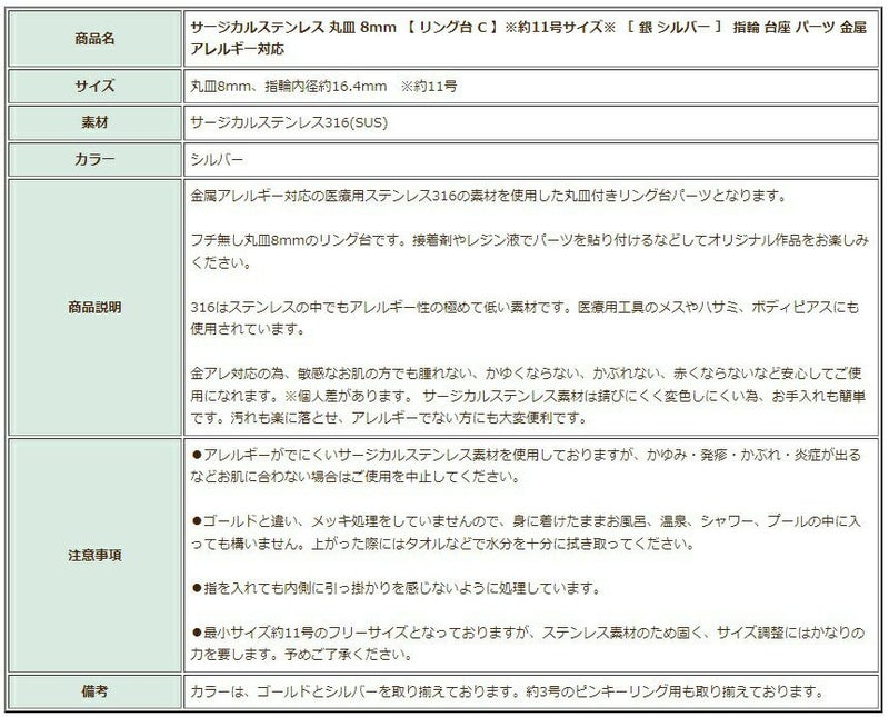 商品名 サージカルステンレス 丸皿 8mm 【 リング台 C 】※約11号サイズ※ [ 銀 シルバー ] 指輪 台座 パーツ 金属アレルギー対応