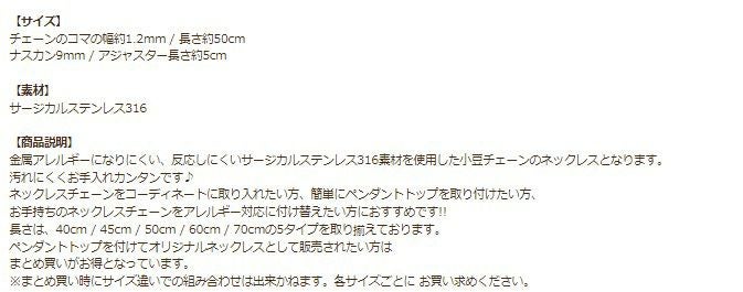 金属アレルギーになりにくい、反応しにくいサージカルステンレス316素材を使用した小豆チェーンのネックレスとなります。