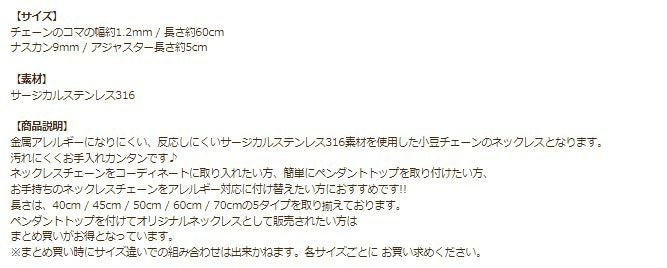 金属アレルギーになりにくい、反応しにくいサージカルステンレス316素材を使用した小豆チェーンのネックレスとなります。