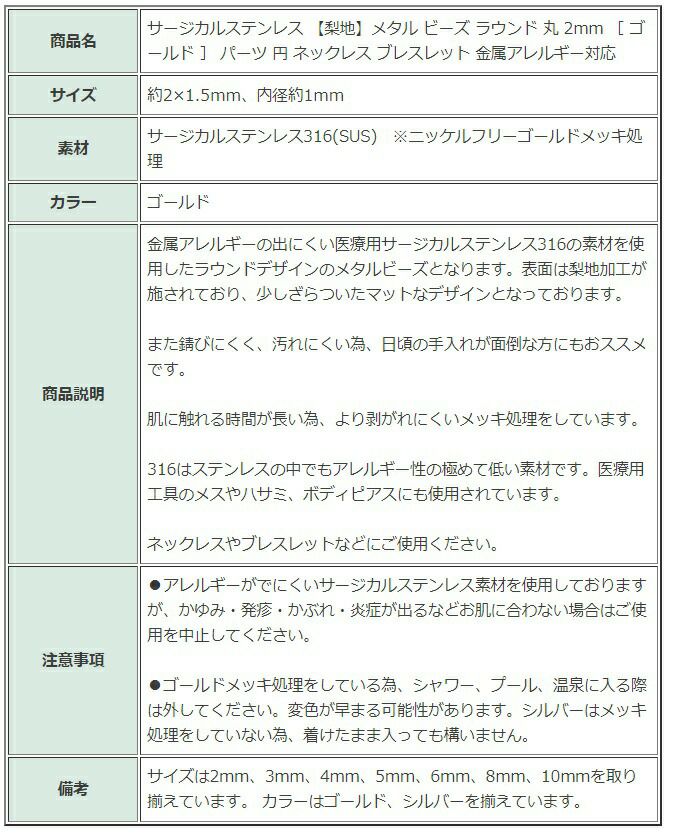 商品名 サージカルステンレス 【梨地】メタル ビーズ ラウンド 丸 2mm [ ゴールド ] パーツ 円 ネックレス ブレスレット 金属アレルギー対応