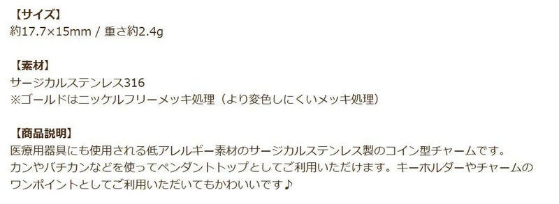 医療用器具にも使用される低アレルギー素材のサージカルステンレス製のコイン型チャームです。