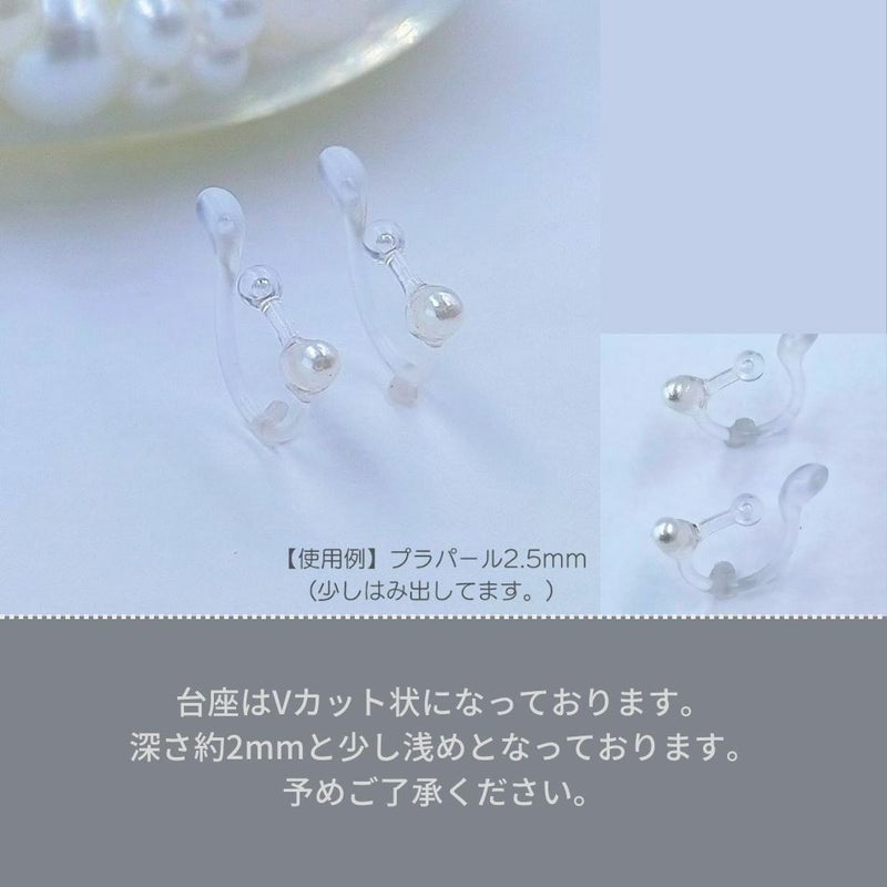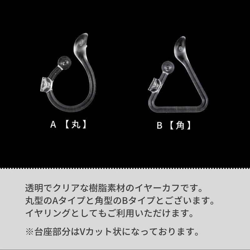 商品説明 金属アレルギーの出にくいプラスチック樹脂を使用した台座付きイヤーカフとなります。クリアで目立ちにくいので、ノンホールピアスのようにご利用いただくことも出来ます。
