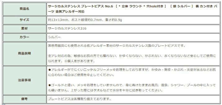 商品名 サージカルステンレス プレートピアス No.6 【 * 立体 ラウンド * 穴hole付き 】 [ 銀 シルバー ] 裏 カン付き パーツ 金属アレルギー対応