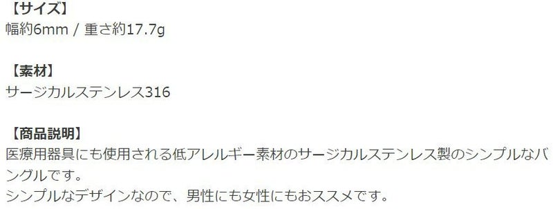 医療用器具にも使用される低アレルギー素材のサージカルステンレス製のシンプルなバングルです。