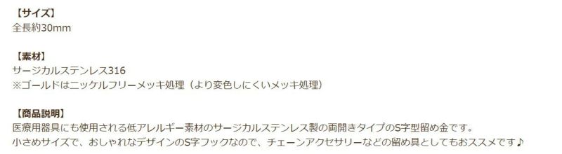 小さめサイズで、おしゃれなデザインのS字フックなので、チェーンアクセサリーなどの留め具としてもおススメです♪