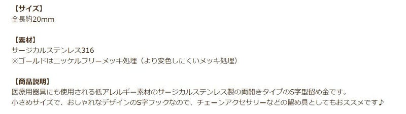小さめサイズで、おしゃれなデザインのS字フックなので、チェーンアクセサリーなどの留め具としてもおススメです♪