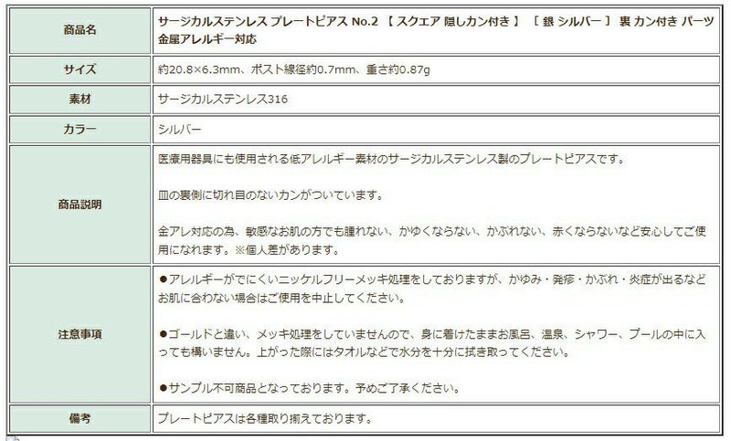 商品説明 医療用器具にも使用される低アレルギー素材のサージカルステンレス製のプレートピアスです。