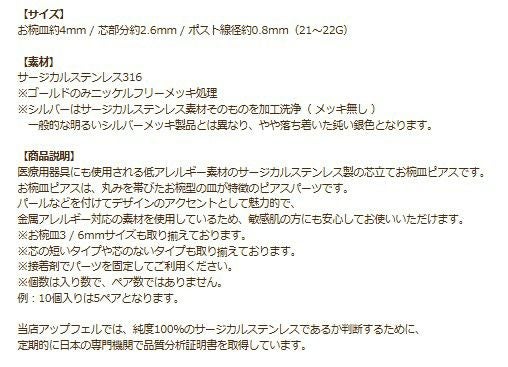 医療用器具にも使用される低アレルギー素材のサージカルステンレス製の芯立てお椀皿ピアスです。