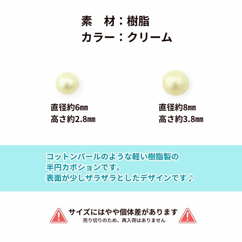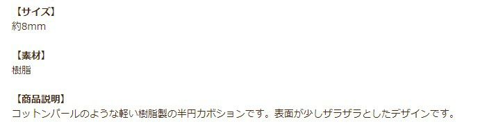 コットンパールのような軽い樹脂製の半円カボションです。表面が少しザラザラとしたデザインです。