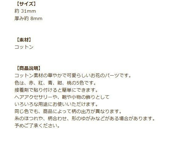 コットン素材の華やかで可愛らしいお花のパーツです。