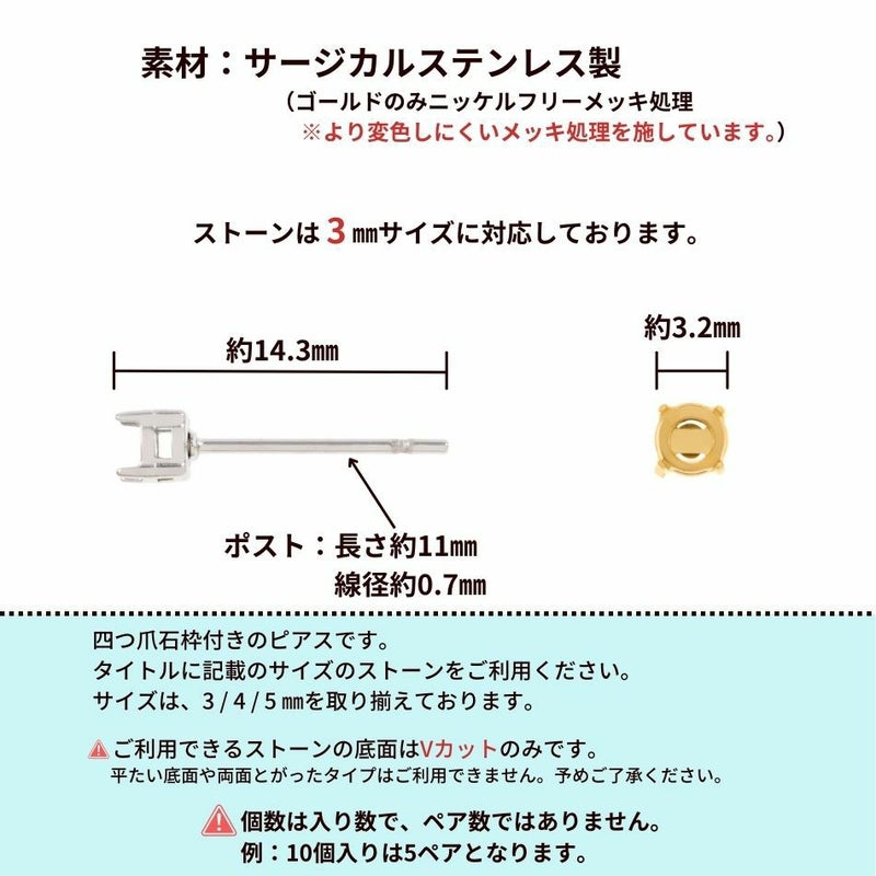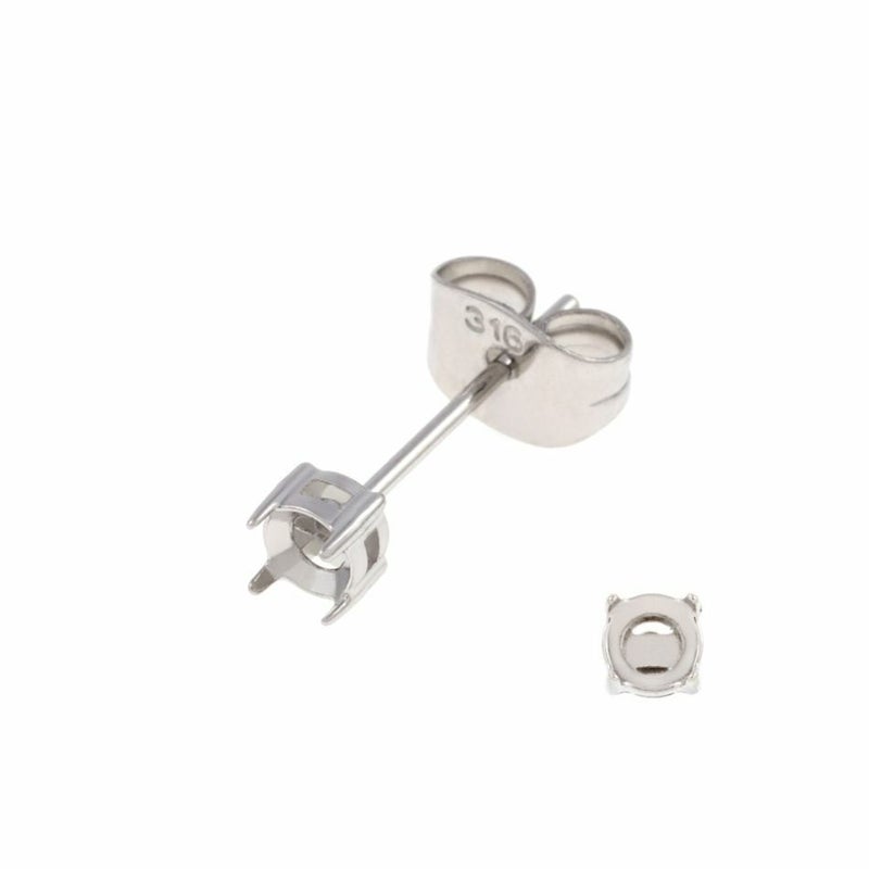 [4個] * 石枠 爪留め * ピアス 3mm [ 銀 シルバー ] キャッチ付き サージカルステンレス 四つ爪 石留め 台座 パーツ 石枠 爪留め 石留め 金属アレルギー対応 P1-06