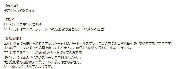 医療用器具にも使用される低アレルギー素材のサージカルステンレス製の四つ爪石留め台座タイプの立て爪ピアスです。