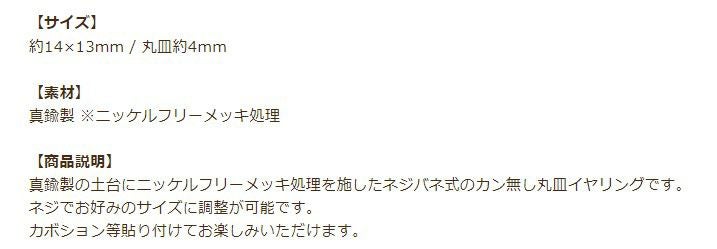 イヤリング金具はカン付きやカボションなどを貼り付ける丸皿タイプ、お椀皿、芯有り、シャワータイプなどがあります。