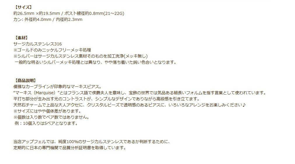 アップフェルは金属アレルギーの方でも安心してお使いいただけるサージカルステンレス素材のアクセサリーパーツをメインに扱っている専門ショップです。