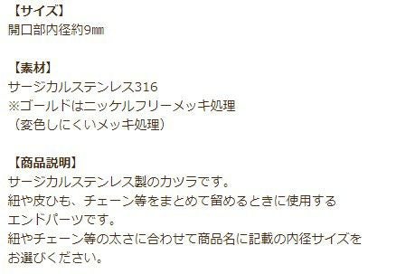 カシメはヒモや革ヒモを留め金具などにつなぐための金具です。ヒモの端に潰すようにかしめて使います。デザインは丸目や角目などがあります。