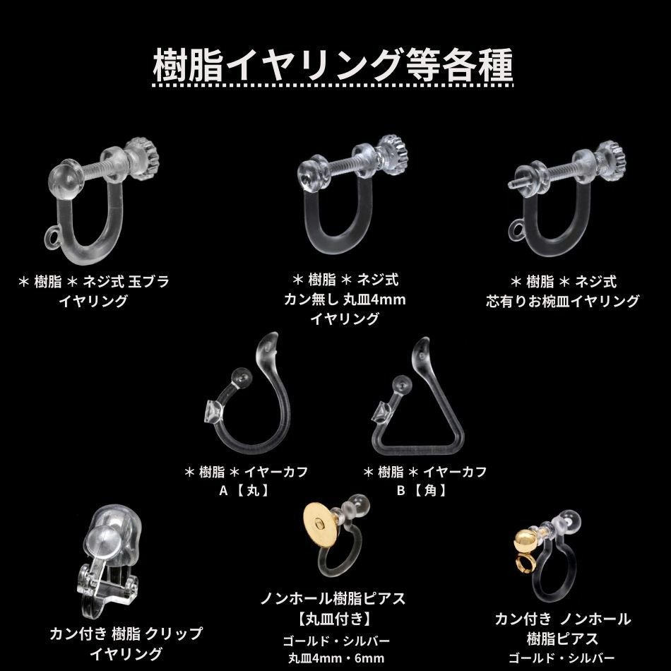 イヤリング金具はカン付きやカボションなどを貼り付ける丸皿タイプ、お椀皿、芯有り、シャワータイプなどがあります。