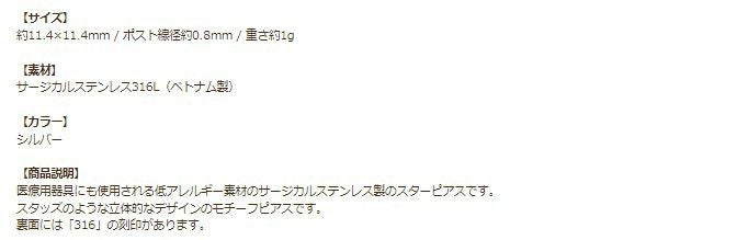 ピアスポストパーツは台座部分に加えてポスト部分も全てサージカルステンレス素材で製作しています。