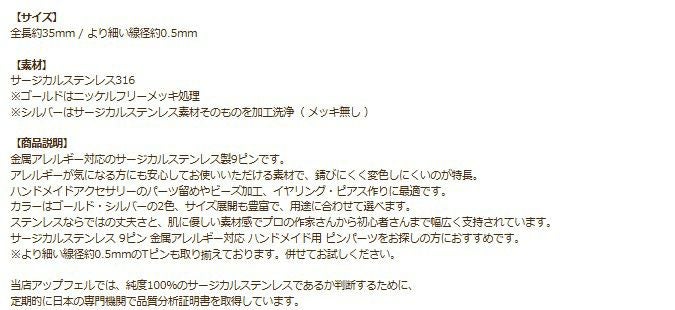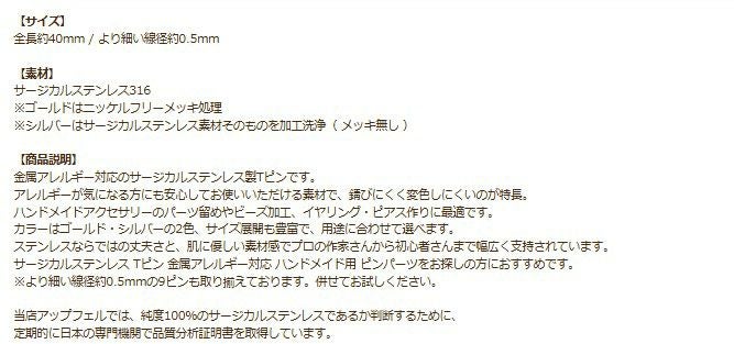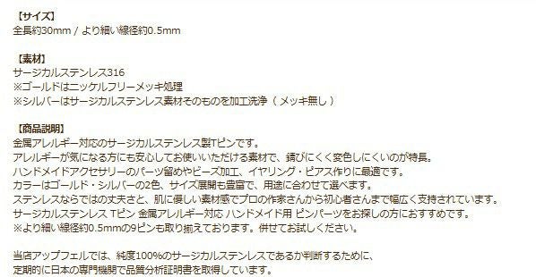 アクセサリーパーツやビーズ作品に最適なサージカルステンレス製Tピン