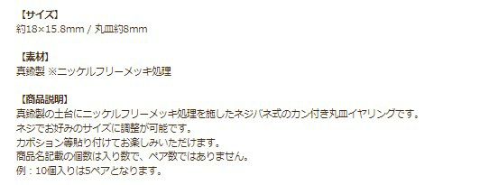 イヤリング金具はカン付きやカボションなどを貼り付ける丸皿タイプ、お椀皿、芯有り、シャワータイプなどがあります。