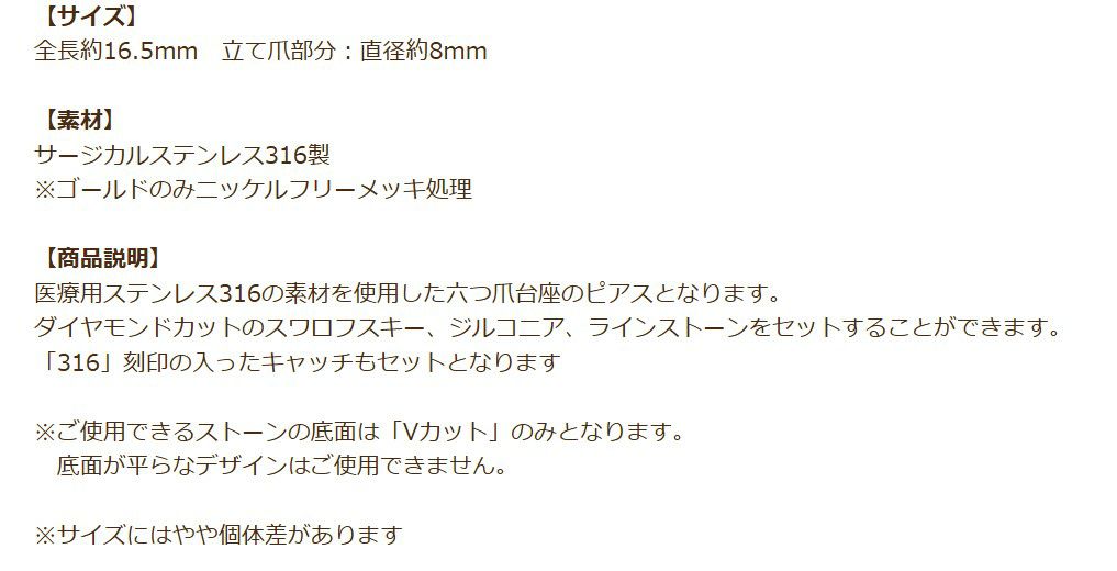 お好みの天然石ストーンやスワロフスキー、キュービックジルコニア(人工石)をピアスポストにつけたい時は立て爪ピアスポスト、4つ爪ピアスポスト、石枠・爪留めピアスポストがおすすめです。ラウンド、スクエアのストーンを嵌めることができます。