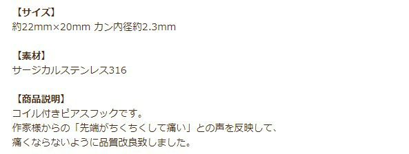 他の画像を見る 金属アレルギー 医療用 素材 お手入れ簡単 316L [10個] ピアス フック B [ 銀 シルバー ] サージカルステンレス パーツ 金属アレルギー 金具 当店特別価格 ¥ 329 税込 カートに入れる お気に入りに登録する